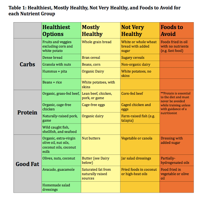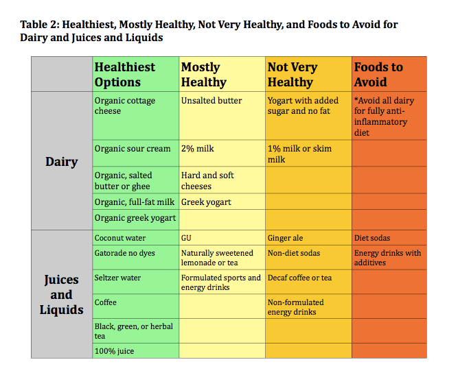 Foods that are bad for you are typically bad because they require more processing than the calories are worth, overwhelming the body with stress hormones (i.e. cortisol) and free radicals (particles that can damage cells) and eventually inflaming the body. This is not only detrimental to your health, but can lead to serious health consequences (e.g. having a heart attack during marathon even though at a healthy weight). Below are the top 5 things you should know to help decrease inflammation and increase performance. Incorporating this knowledge will also increase your overall health. See Tables 1 and 2 for lists of the healthiest, mostly healthy, not very healthy, and foods to avoid in each nutrient group on a regular basis.